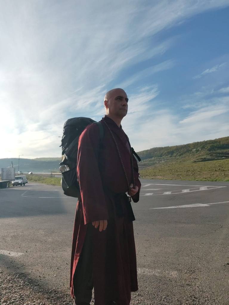 The next day, at six in the morning, Josho set out from Cluj in his robes, with the fifty-litre rucksack strapped to him, with water, with vitamins, with a small statue of green Tara in his pocket. Forty-two kilometres on the first day: the wilderness past Gârbău, the hills he calls “Bardo,” the village of Dumbrava, the E60 expressway with cars flying centimetres past him, the village of Inucu where he stopped with a tired face and an intact smile. The phone wouldn’t charge anymore. The vitamins did their work. At every spring, at every rock, at every place that asked for his attention, he stopped and recited prayers for the beings of that place.